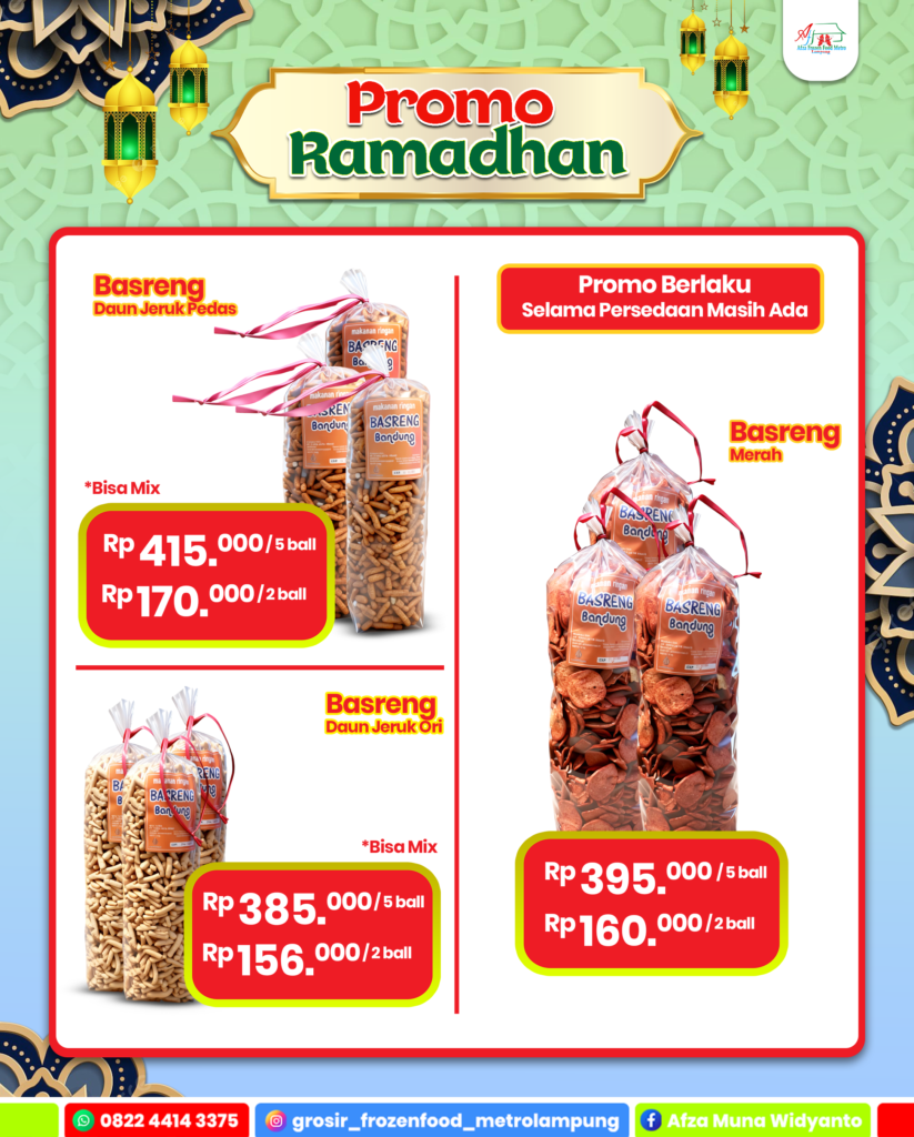 Promo Bundling Ramadhan 🎉 PROMO RAMADHAN BUNDLING 🎉Teman setia buka puasa & persiapan Lebaran kini makin irit! 📅 Berlaku 1 – 7 Maret 2026 🔥 Paket 1 – Rp144.000✔️ GG Soes 2 kg✔️ Sprite 1 L✔️ Sumber Rezeki Kue Kacang 🔥 Paket 2 – Rp52.000✔️ Fanta 1 L✔️ Sumber Rezeki Kue Kacang✔️ Denex Butter Cookies 💡 Cocok untuk stok di rumah, suguhan tamu, atau hampers Lebaran. 🕘 Jam Operasional: Buka setiap hari pukul 07.00 s.d 21.00 📍 Alamat: Jalan Selagai No.7 Iringmulyo Metro Timur, Kota Metro 📞 WhatsApp: 0822 4414 3375/0821 8151 3787 📷 Instagram: @grosir_frozenfood_metrolampung AFZA JAYA MANDIRI Jl. Selagai RT 006 RW 003 Kelurahan Iringmulyo Kecamatan Metro Timur Kota Metro, Lampung 34124 Copyright © | All Rights Reserved.