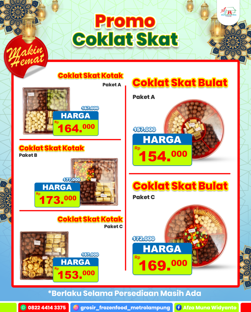 Promo Coklat Sekat 🍫 PROMO COKLAT SKAT SPESIAL! 🍫 Lagi cari camilan manis buat lebaran? Sekarang waktunya borong Coklat Skat dengan harga lebih hemat! ✨ Tersedia berbagai pilihan paket: Coklat Skat Kotak * Paket A: Rp164.000 * Paket B: Rp173.000 * Paket C: Rp153.000 Coklat Skat Bulat * Paket A: Rp154.000 * Paket C: Rp169.000 Promo berlaku selama persediaan masih ada! Jangan sampai kehabisan, langsung amankan sebelum stok habis. 📍 Tersedia di Afza Frozen Food 📞 0822 4414 3375 AFZA JAYA MANDIRI Jl. Selagai RT 006 RW 003 Kelurahan Iringmulyo Kecamatan Metro Timur Kota Metro, Lampung 34124 Copyright © | All Rights Reserved.
