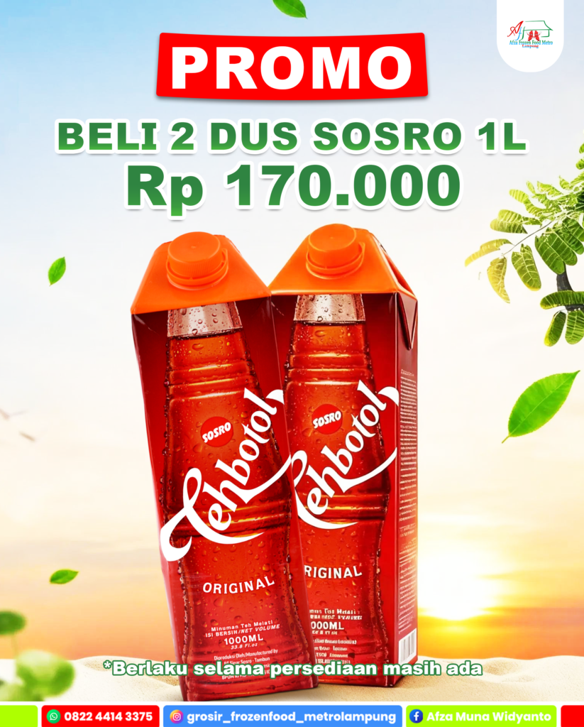 Beli 2 Dus Lebih Hemat Lagi cari minuman segar buat stok di rumah? Sekarang lagi ada PROMO HEMAT! Beli 2 dus Sosro 1L hanya Rp170.000 Segar, praktis, dan cocok buat segala momen. Mulai dari kumpul keluarga sampai sajian tamu di rumah. Promo terbatas, selama stok masih ada. Yuk langsung borong sebelum kehabisan! AFZA JAYA MANDIRI Jl. Selagai RT 006 RW 003 Kelurahan Iringmulyo Kecamatan Metro Timur Kota Metro, Lampung 34124 Copyright © | All Rights Reserved.