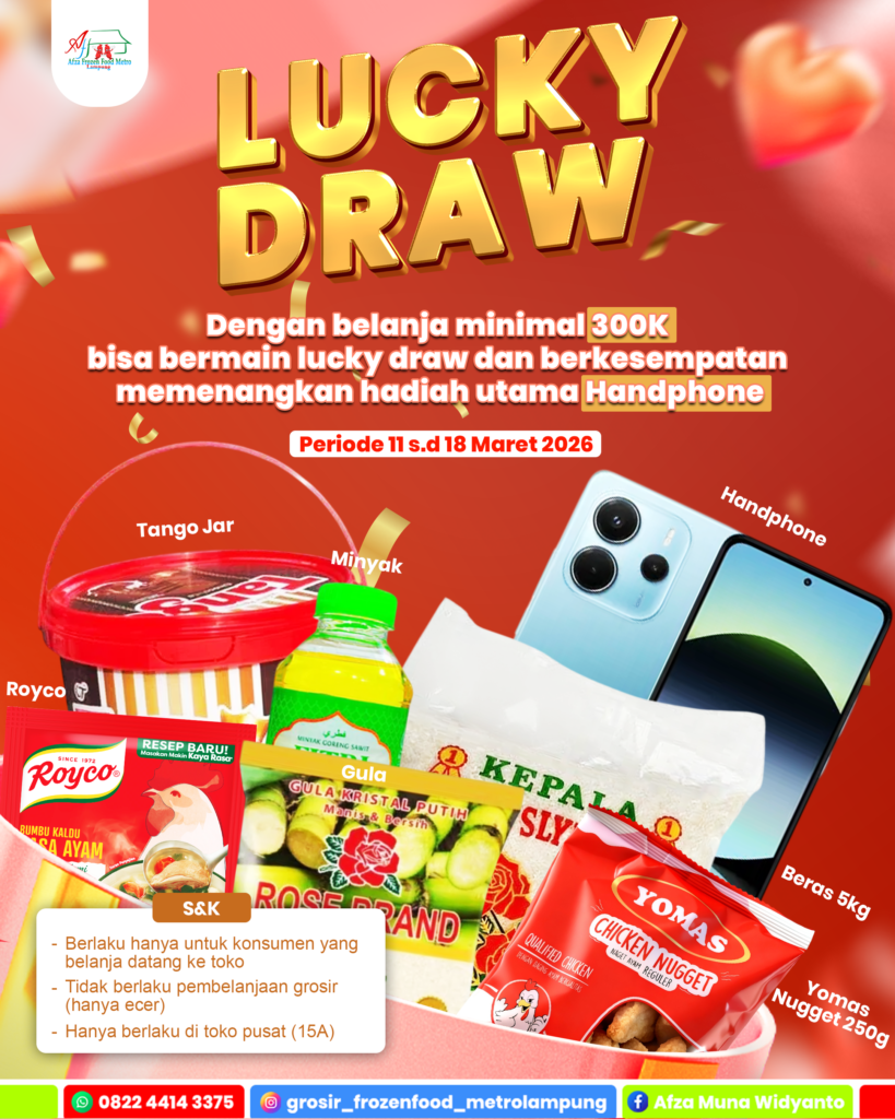 Promo Lucky Draw 🎉 LUCKY DRAW SPESIAL RAMADHAN! 🎉 Belanja kebutuhan dapur sekaligus dapat kesempatan bawa pulang hadiah! 😍 Cukup belanja minimal 300K, kamu sudah bisa bermain Lucky Draw dengan berbagai hadiah menarik, bahkan hadiah utama HANDPHONE! 📱✨ Hadiah lainnya juga banyak seperti:🥫 Tango Jar🍚 Beras 5kg🍗 Yomas Nugget🧂 Royco🛢️ Minyak🍬 Gula 📅 Periode: 11 – 18 Maret 2026 Buruan belanja dan coba keberuntungan kamu!Siapa tahu pulang-pulang bawa HP baru. AFZA JAYA MANDIRI Jl. Selagai RT 006 RW 003 Kelurahan Iringmulyo Kecamatan Metro Timur Kota Metro, Lampung 34124 Copyright © | All Rights Reserved.